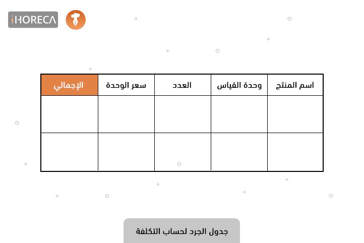 · قم بعمل ورقة جرد للمطعم من خلال رسم جدول مكون من (٥) صفوف سواء يدويًا باستخدام الورقة والقلم أو جداول البيانات الإلكترونية " Excel Sheets " أو باستخدام برامج إدارة المخزون المخصصة لذلك، وقم بتسمية الصفوف كالتالي؛ اسم المنتج، وحدة القياس، العدد، سعر الوحدة، التكلفة الإجمالية.